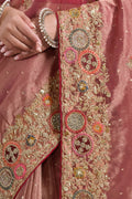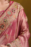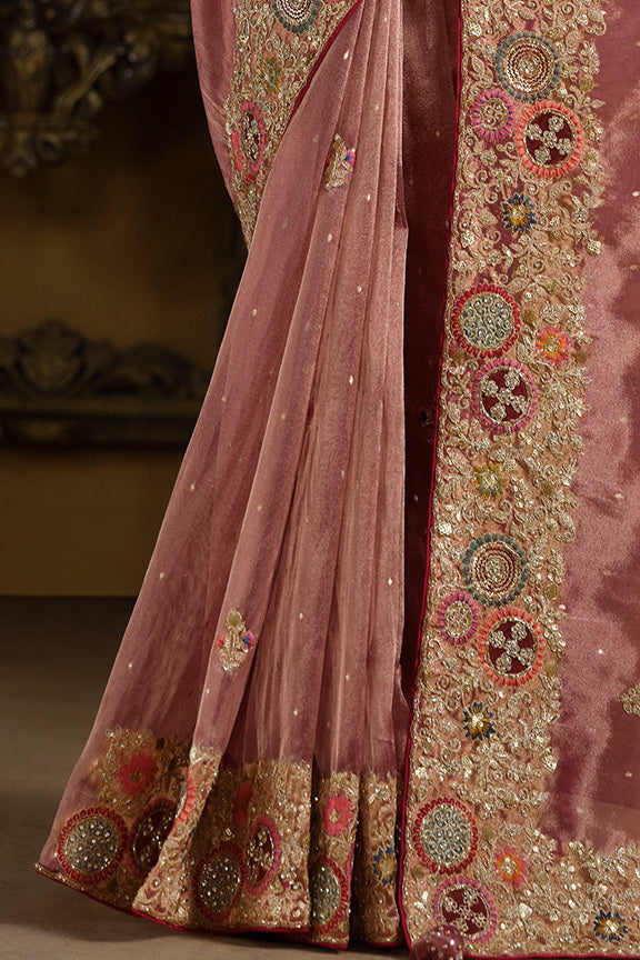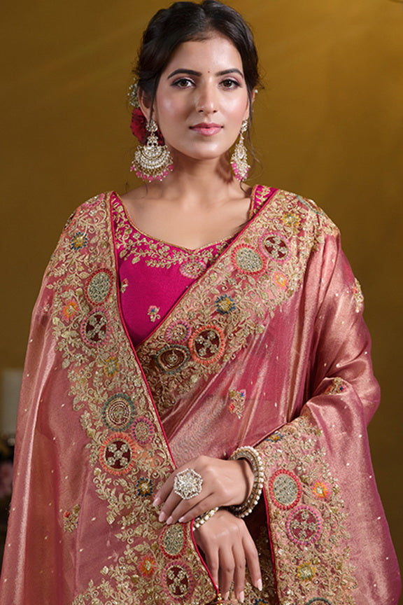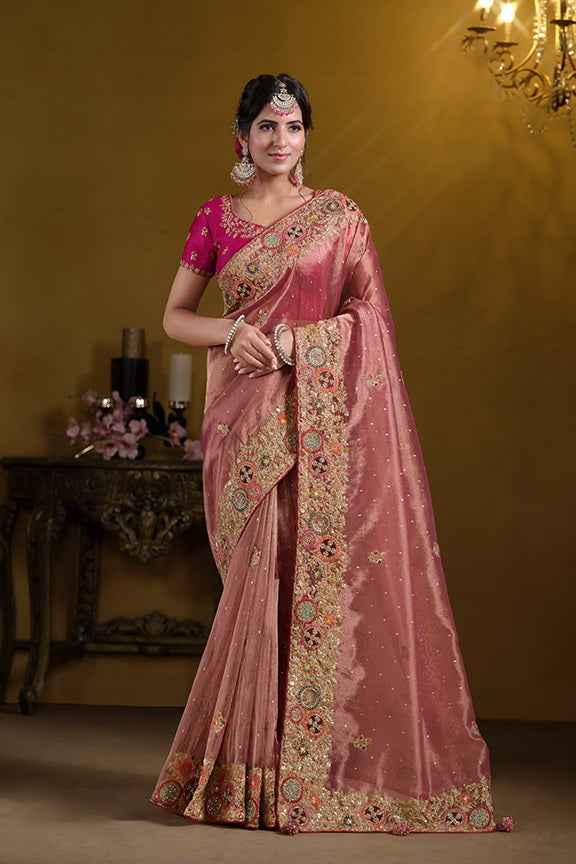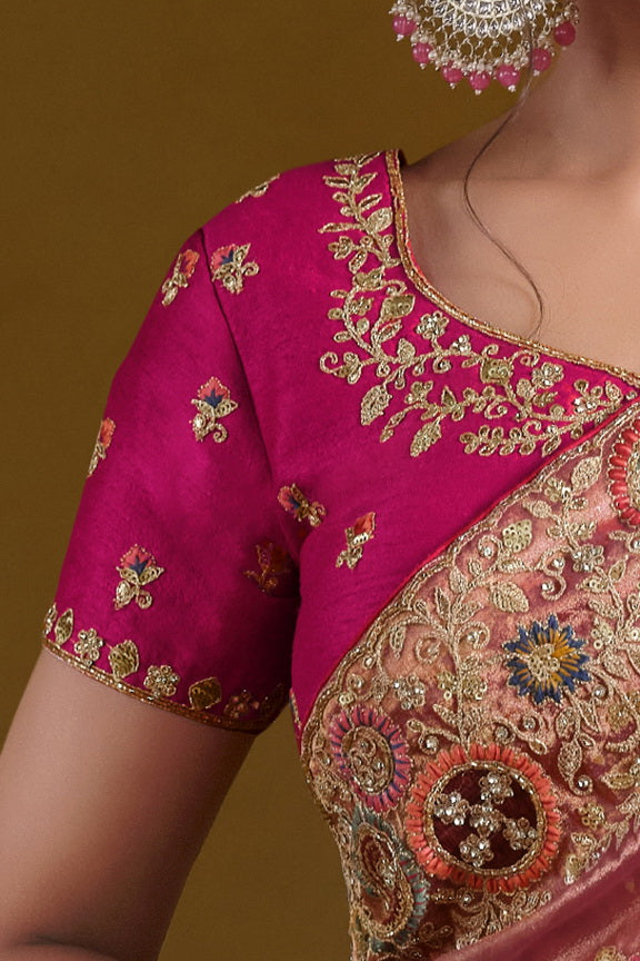 Peach Zari Organza Silk Pure Khatli work Designer Saree With Blouse.