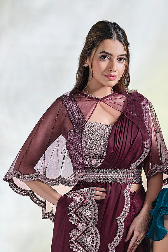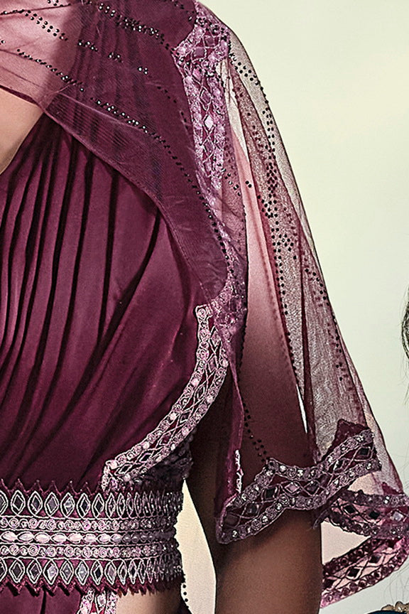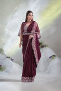 Wine Mirror Work Satin Silk Ready to Wear Saree