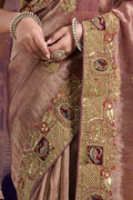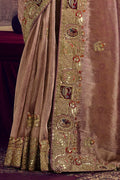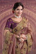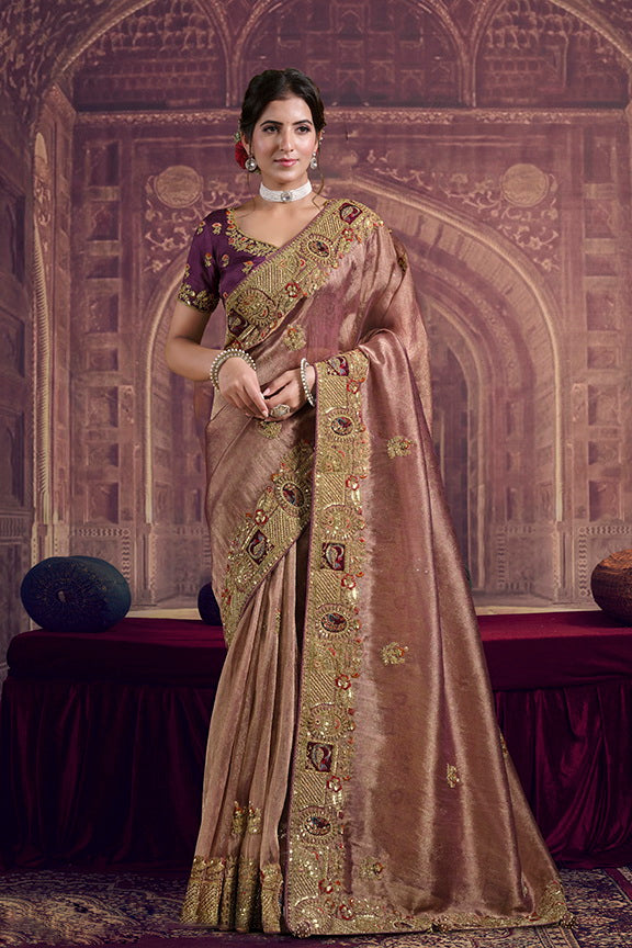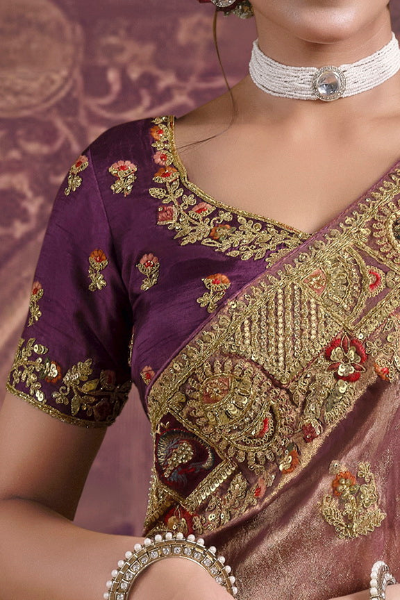 Wine Gold Zari Organza Silk Pure Khatli Work Saree