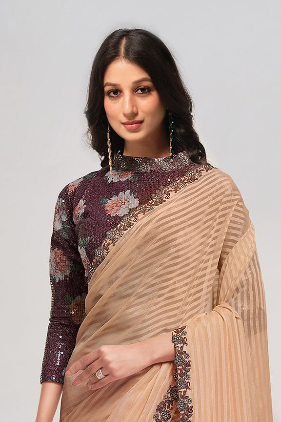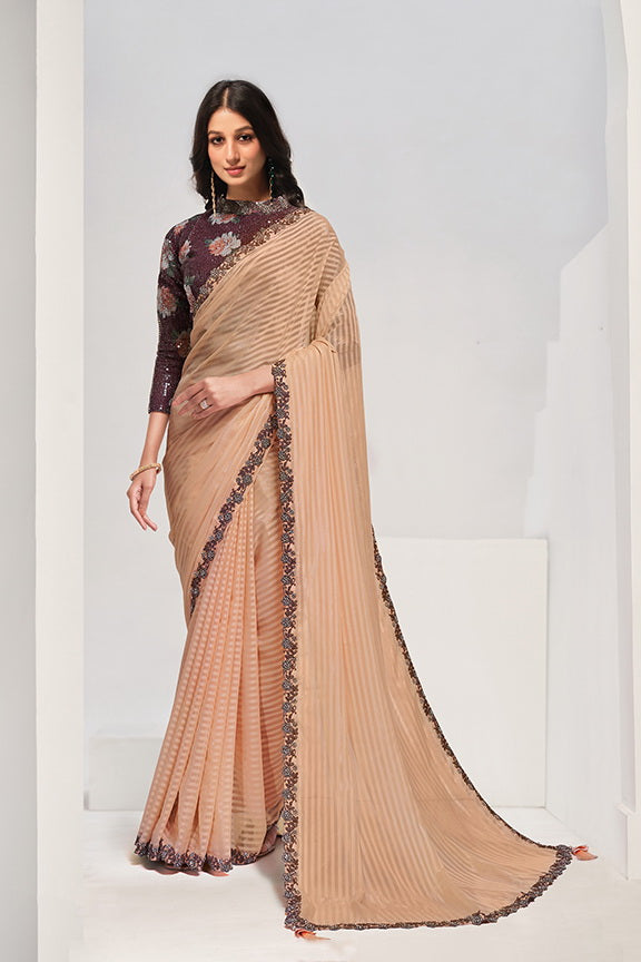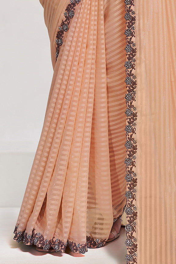 Peach Georgette Stone Work with Embroidery Saree with Unstitched Blouse