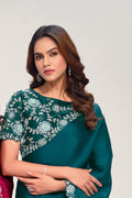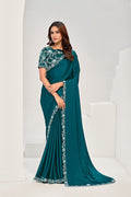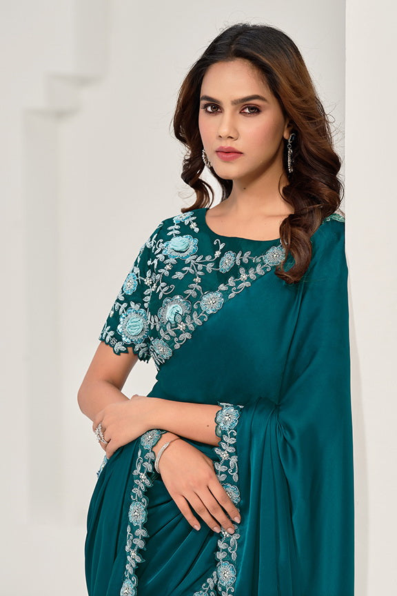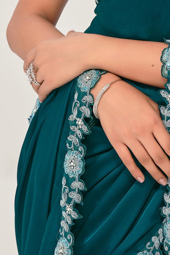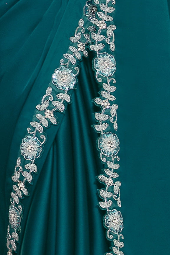 Teal Crepe Satin Silk Sequence & Applique Saree with Unstitched Blouse Piece