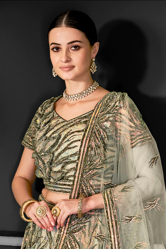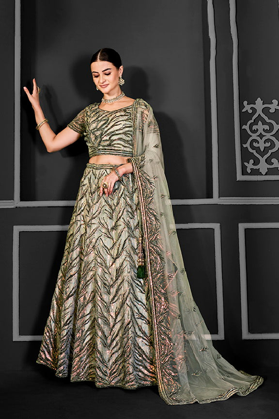 Green Net Embroidered Semi Stitched Lehenga Choli