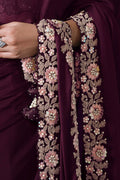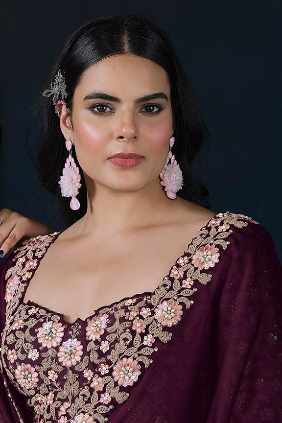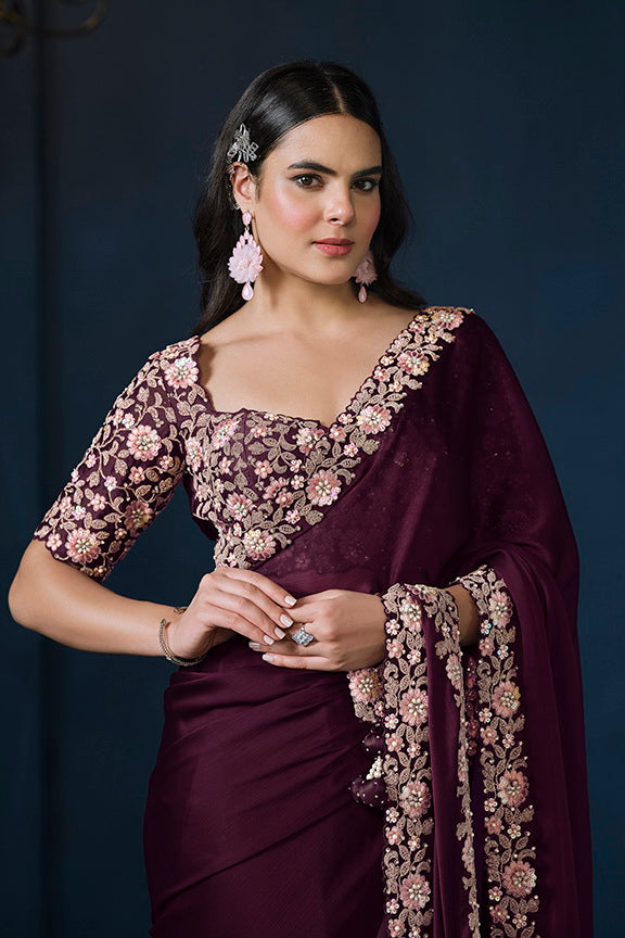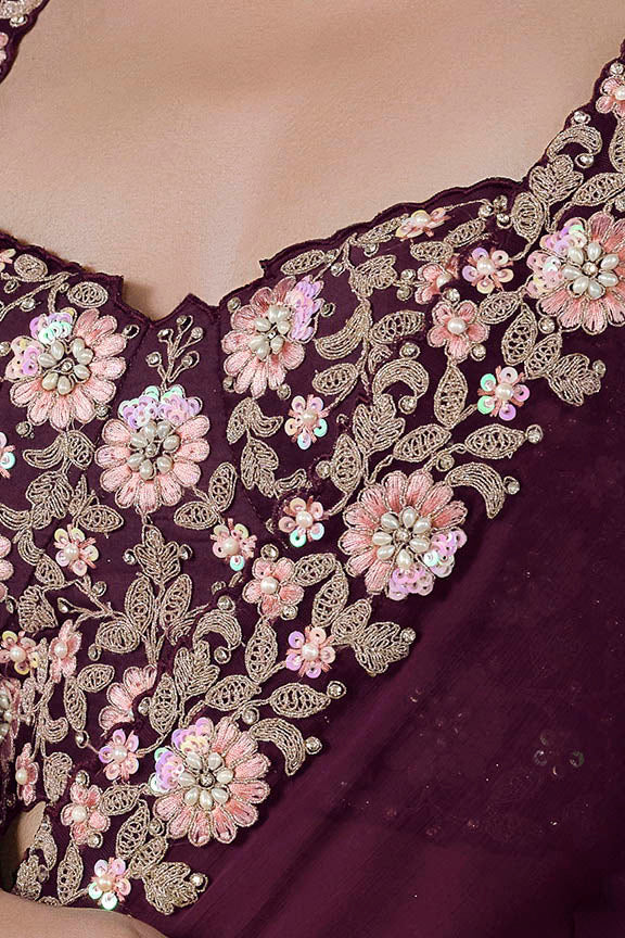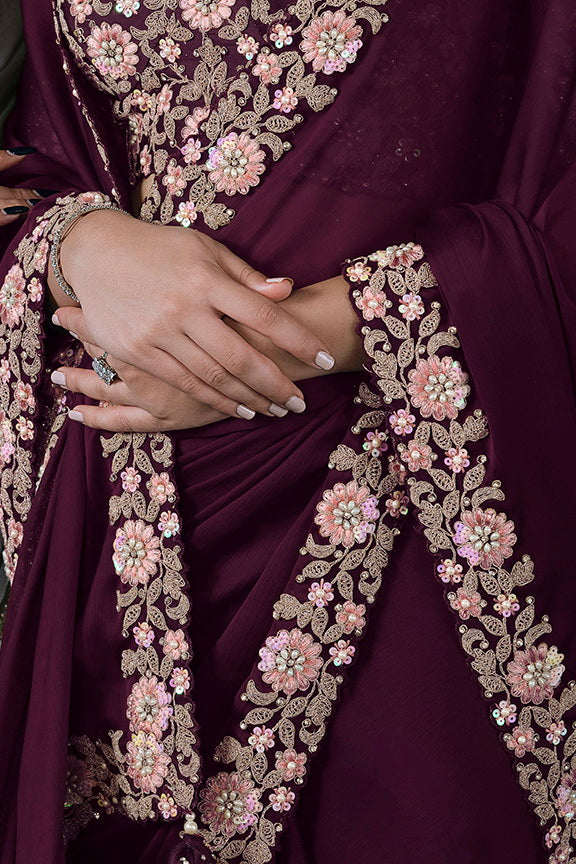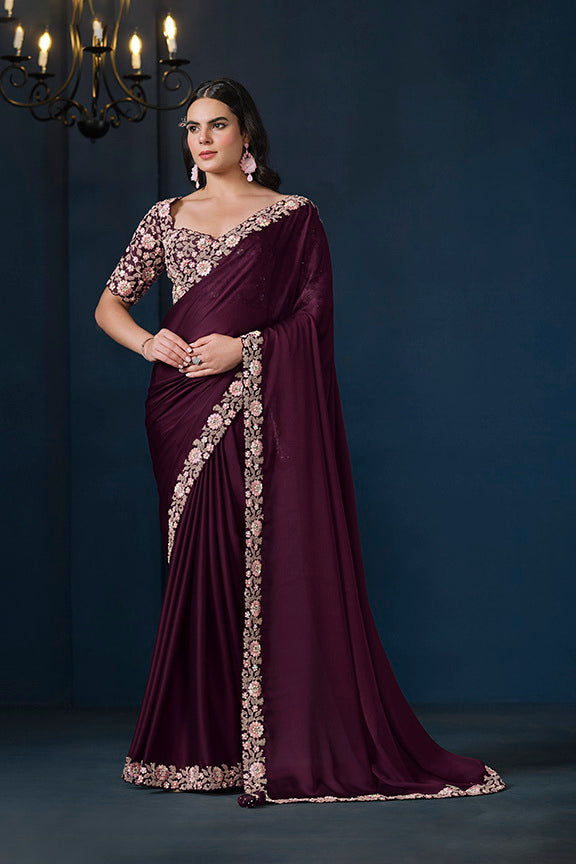 Wine Satin Chiffon Sequins with Moti work Saree with Unstitched Blouse