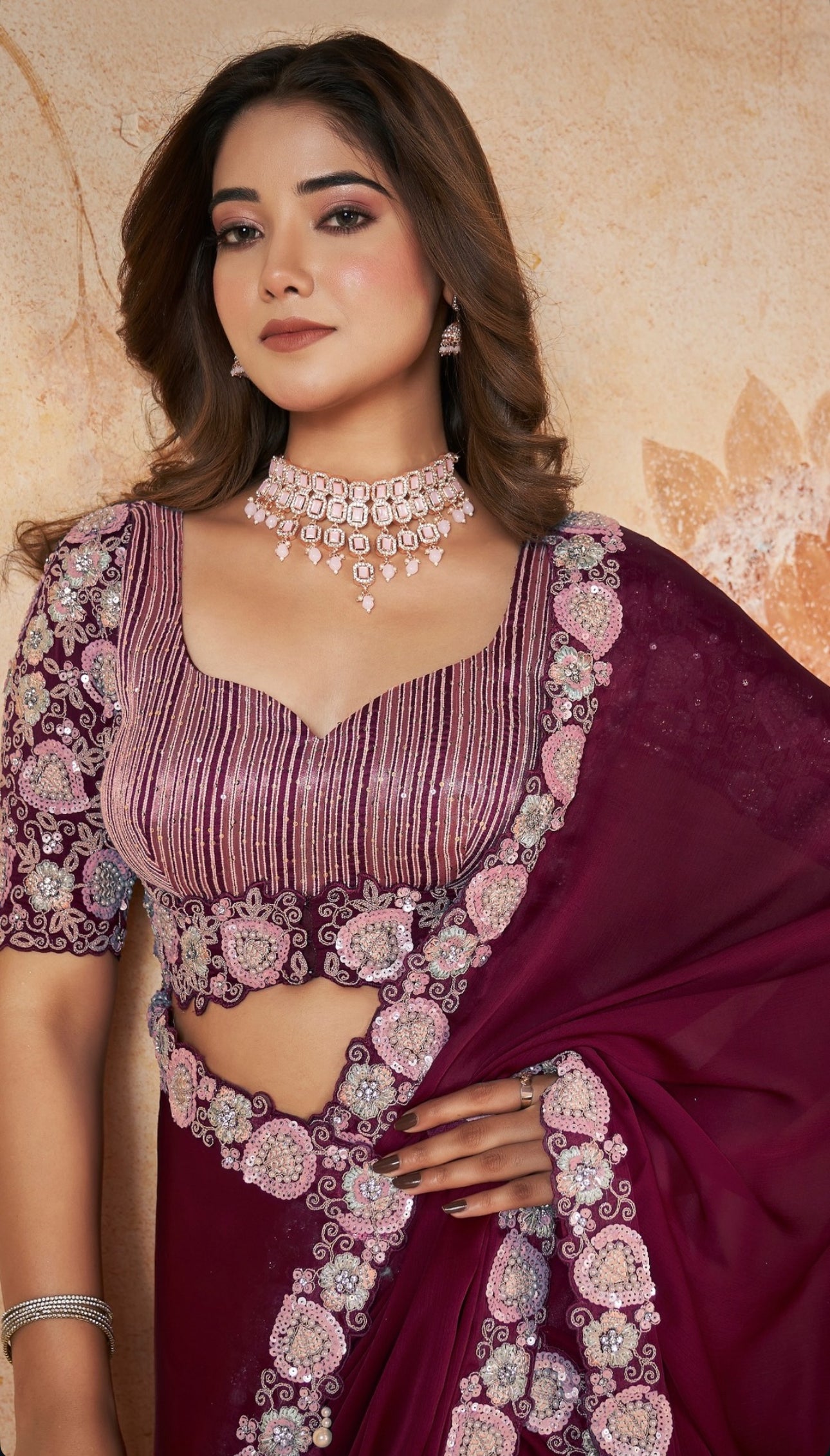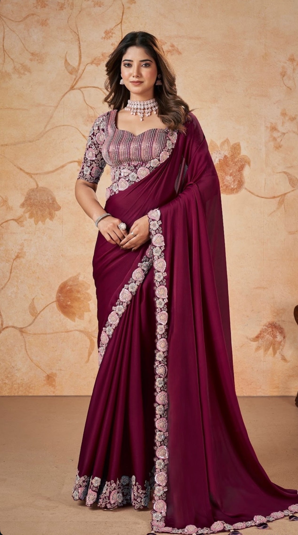 Wine Silk Embroidered Saree with Unstitched Blouse