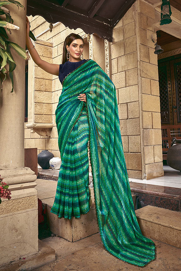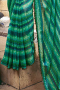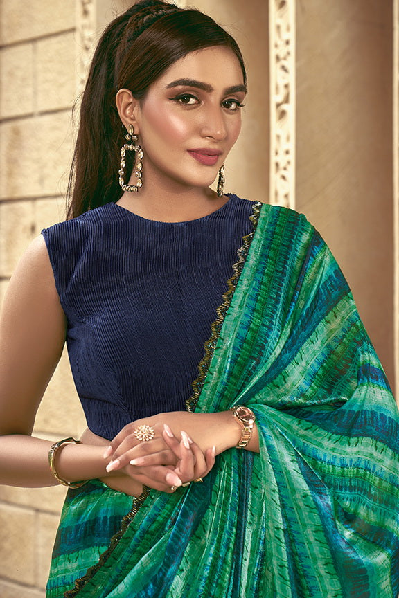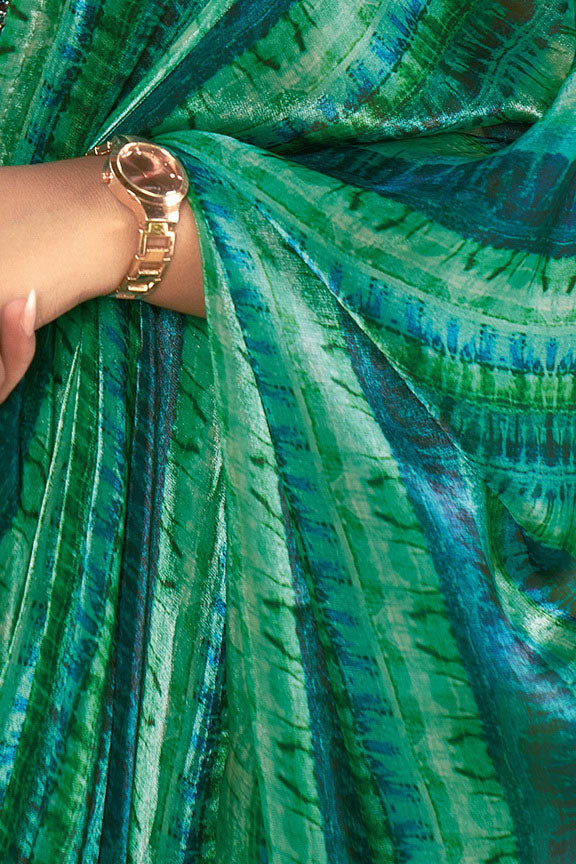Green Sparking Satin Silk Printed Saree with Unstitched Blouse