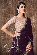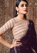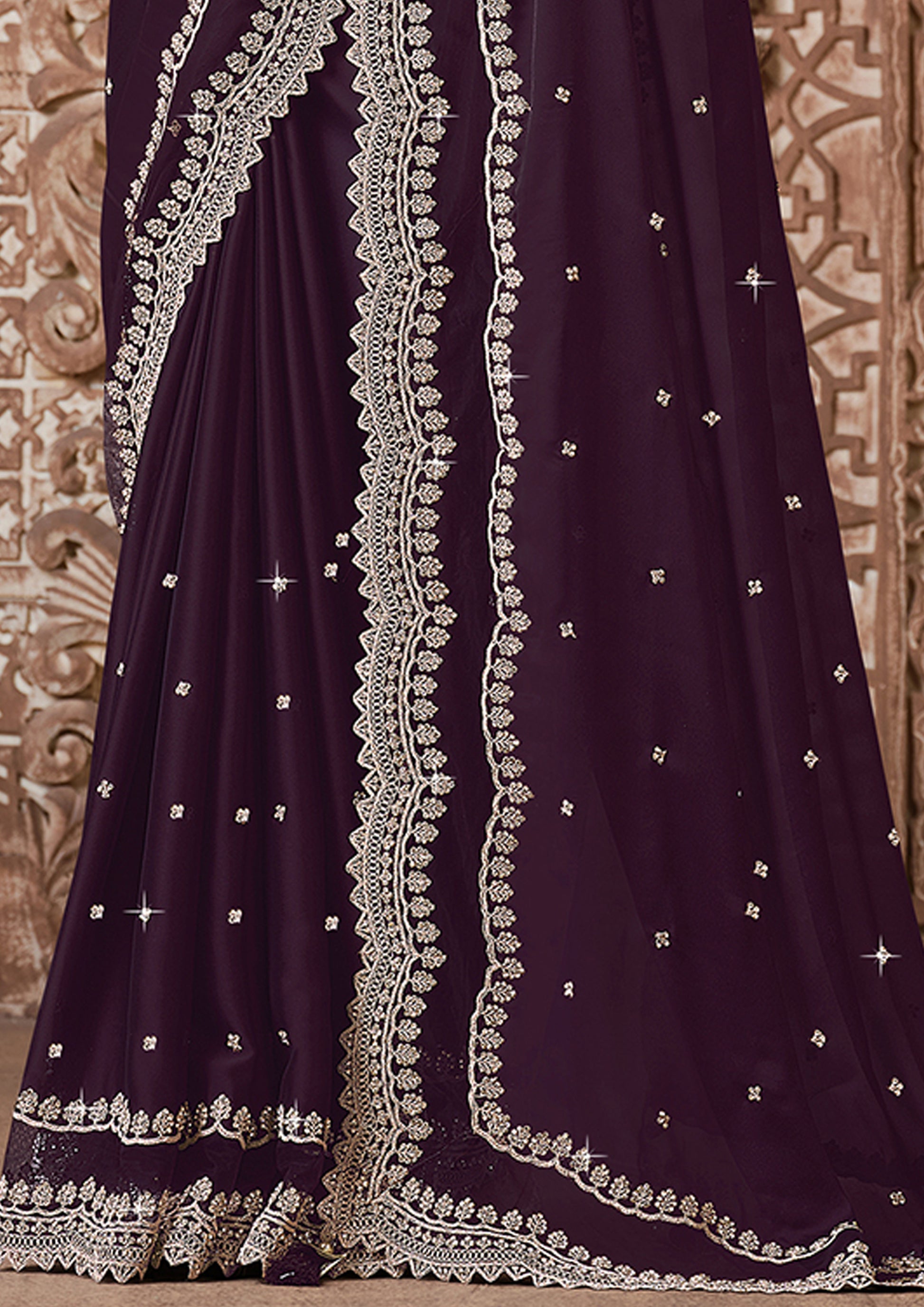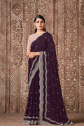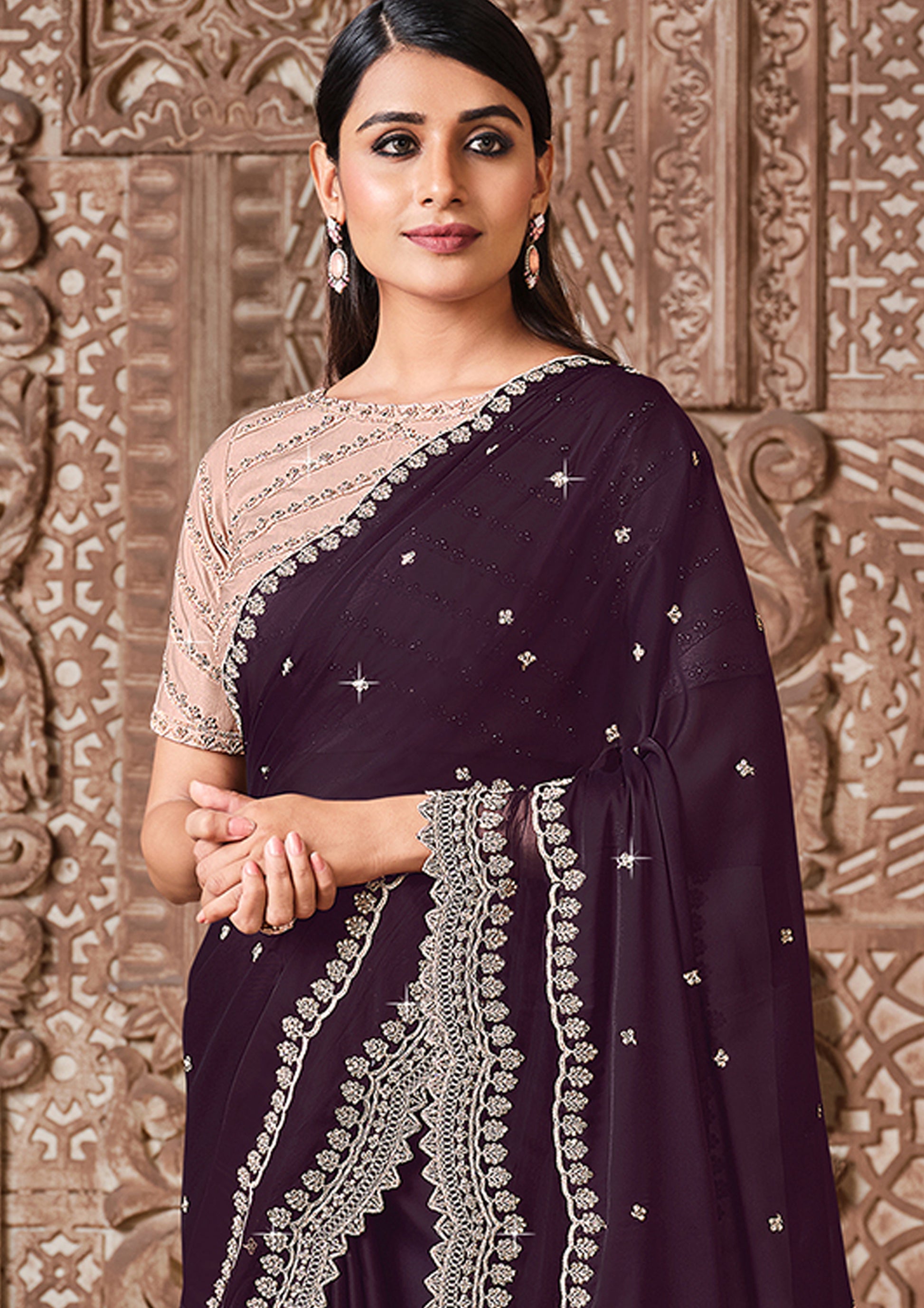 Wine Silk Georgette Embroidered Saree with Unstitched Blouse
