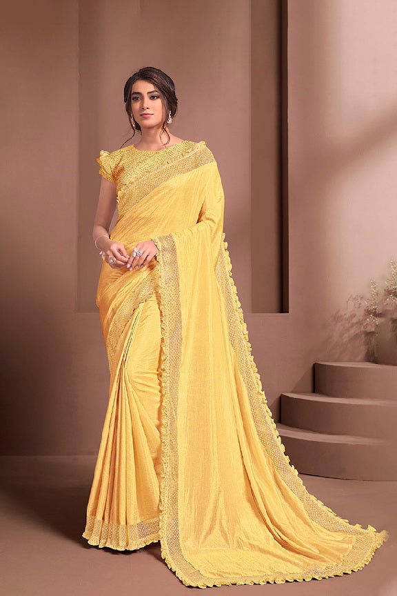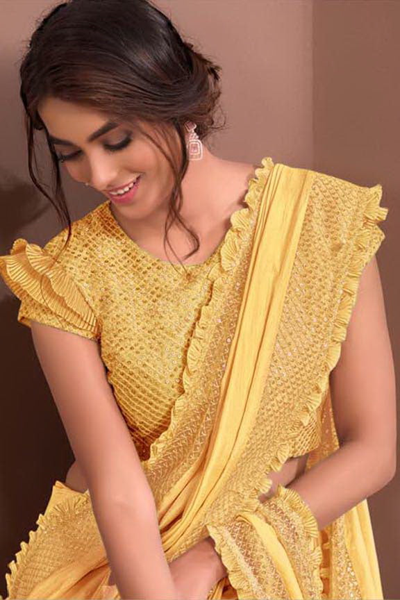 Yellow Silk Georgette Embroidered Saree With Unstitched Blouse